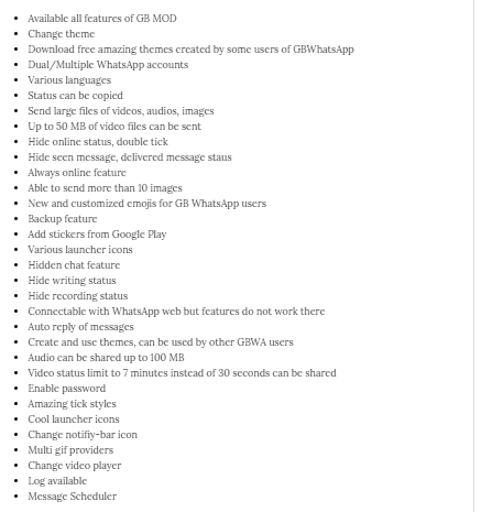 GBWhatsapp comes with lots of features and many improvements. GBWhatsApp has many new themes and privacy features. With GBWhatsApp you can freeze/pause/fake your (Last Seen). Manage groups – only admins can send messages in groups. Send multi messages to many contacts at once. Delete/recall messages sent by mistake even after hours or days. Auto-reply messages when you are busy. Prevent messages from being deleted from your side. Schedule messages to be auto-sent later. Increase video status to 7 minutes instead of 30 seconds on the normal WhatsApp. Send text broadcasts to groups. Send 100 documents at once instead of 30 on normal WhatsApp. Send 100 images at once instead of 10 images on normal WhatsApp. Send audio files with a size of 100MBs instead of the 16MBs on normal WhatsApp. Send video files with the size of 50MBs instead of the 16MBs on normal WhatsApp.