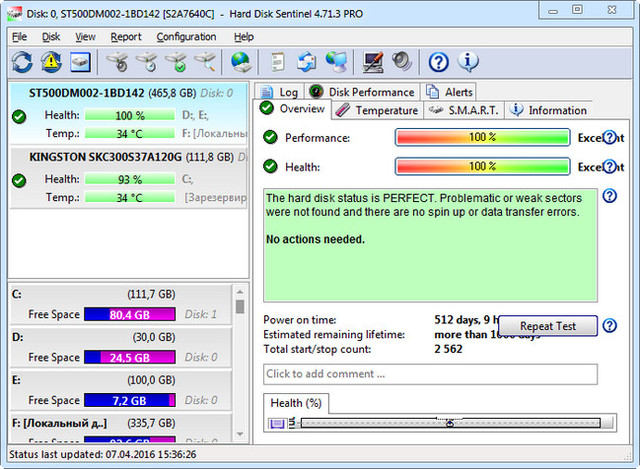 Usually, hard disk health status may slowly decline, from day today. The SMART monitoring technology can predict HDD failure by examining the critical values of the disk drive. Compared to other software, Hard Disk Sentinel detects and reports every disk problem. It is much more sensitive to disk failures and can display better and more detailed information about hard disk expected life and the problems found (if any). This is a more sophisticated way to predict failures than the “traditional” method: checking S.M.A.R.T. attribute thresholds and values only. For more information, please read how hard disk S.M.A.R.T. works and why Hard Disk Sentinel is different.
